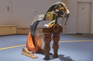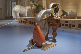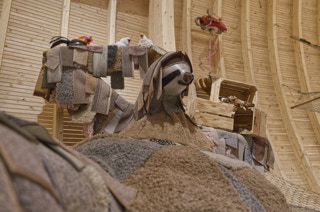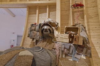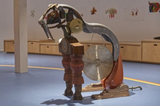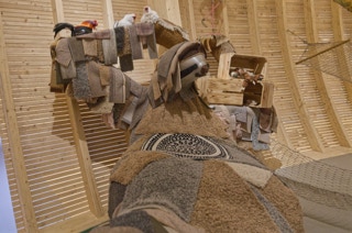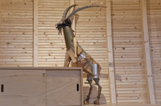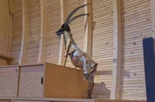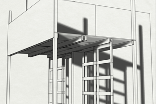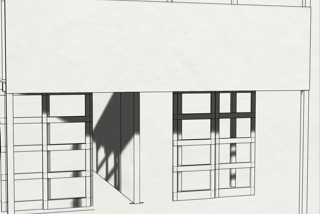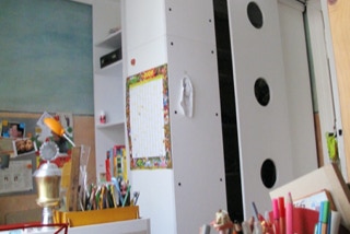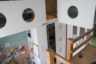 Zimmerteilung eines sehr hohen und großen Raumes in zwei mit Hochebenen und Schiebetüren ausgestattete kleine Räume. Beide mit je einem Fenster, einem Hochbett mit Stiege sowie einer Schiebetür. Vor den nebeneinander angeordneten Türen bleibt ein kleiner Vorraum erhalten. Ständerbau aus Fichtenkonstruktionsholz, beidseitig mit großen quadratischen, weiß gewachsten Paneelen aus Tischlerplatte versehen. Schiebetüren aus Buchenholz mit mattierten Acrylglasfüllungen.