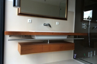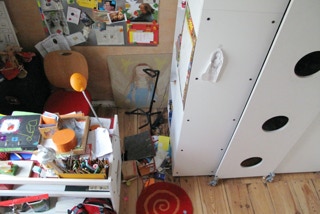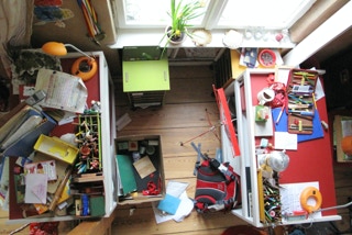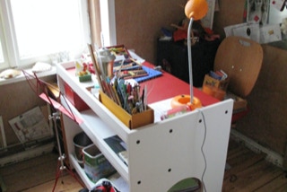 In Zusammenarbeit mit Christoph Beyer entworfenes und gebautes Jugendzimmer mit Hochebene, begehbarem und veränderbarem Kleiderschrank sowie zwei Schreibtischen aus HPL belegter Multiplexplatte, Schreibtische mit Linoleum belegt