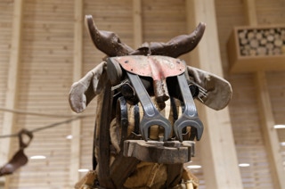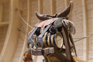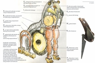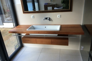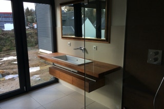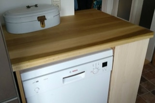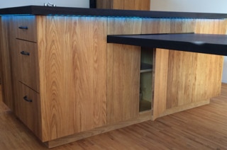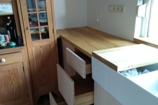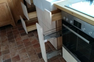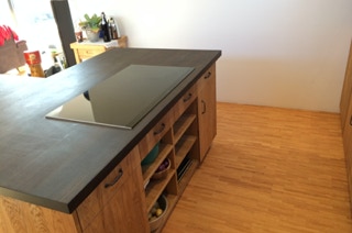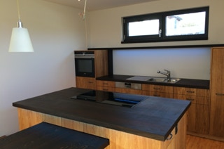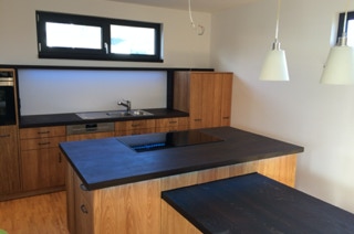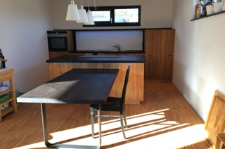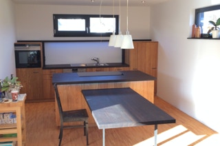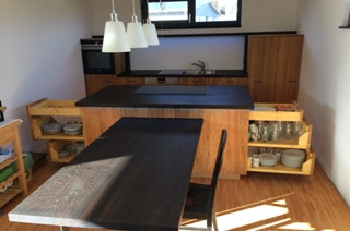 Eine Küche mit integriertem Tisch. Fronten aus Eichenholz, Dreischichtplatte, gebürstet, geölt und gewachst, alle horizontalen Flächen wie Tisch, Arbeitsflächen und Ablagen aus massiver Räuchereiche. Die Schubkästen sind aus Vollholz, ebenso geölt und gewachst.