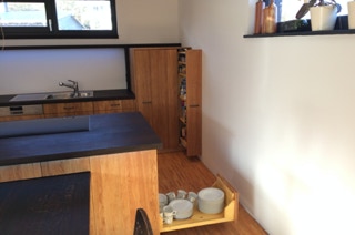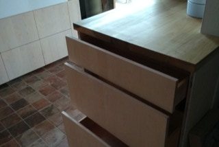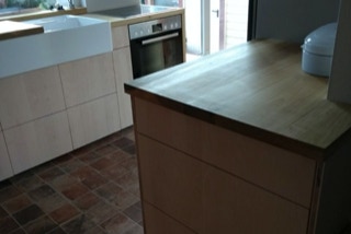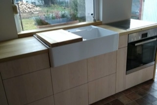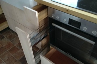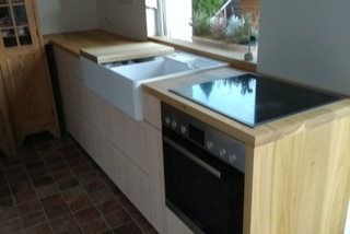 eine kleine Küche in Leipzig, Fronten aus Ahorndreischichtplatte, aufgehellt, Vollholzauszüge, Arbeitsfläche sowie aufgedoppeltes Fensterbrett aus amerikanischer Pappel (Tulipwood), alle Teile geölt und gewachst.